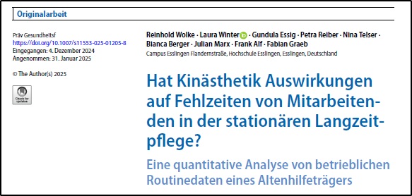 Eine Studie der Hochschule Esslingen in Zusammenarbeit mit der Samariterstiftung Deutschland steht jetzt zur Verfügung. Diese zeigt auf, wie die Kinästhetik betriebliche Gesundheitsförderung, Fehlzeiten der Mitarbeitenden in Pflege und Betreuung beeinflusst. Die positiven Ergebnisse können als Ansporn für Träger verstanden werden, in der Praxis innovative BGM-Projekte zu initiieren.
